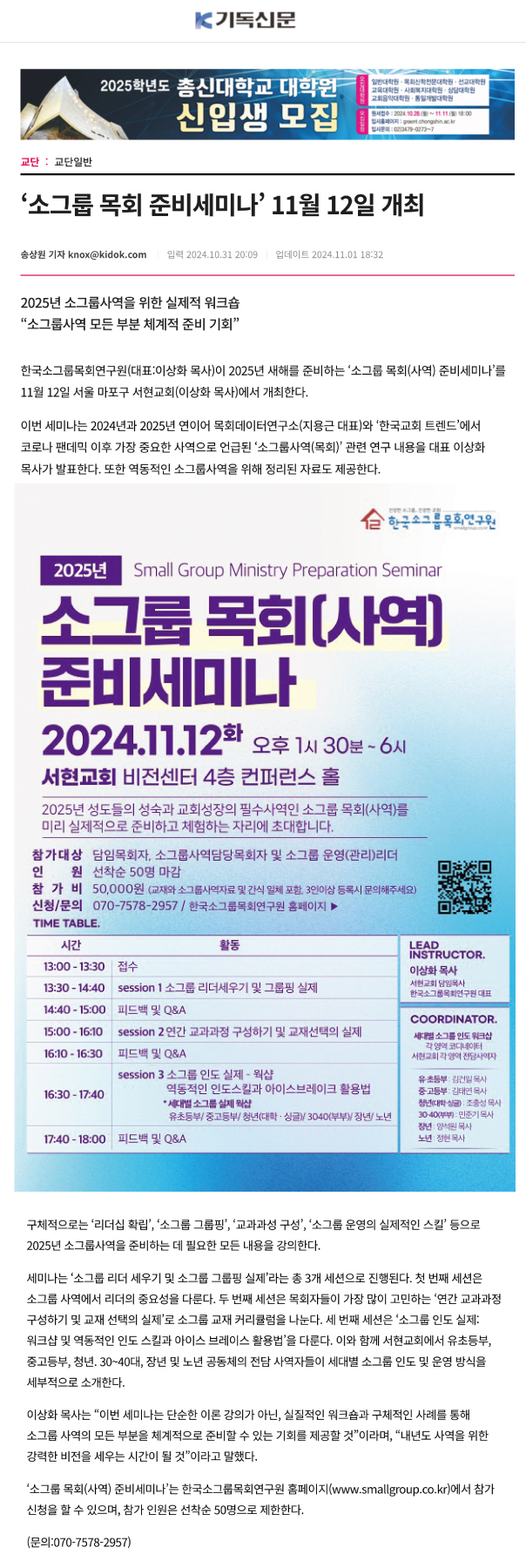 | [±âµ¶½Å¹®] '¼Ò±×·ì ¸ñȸ Áغñ¼¼¹Ì³ª' 11¿ù 12ÀÏ °³ÃÖ, ¼Û»ó¿ø ±âÀÚ. 24.10.31 | |||